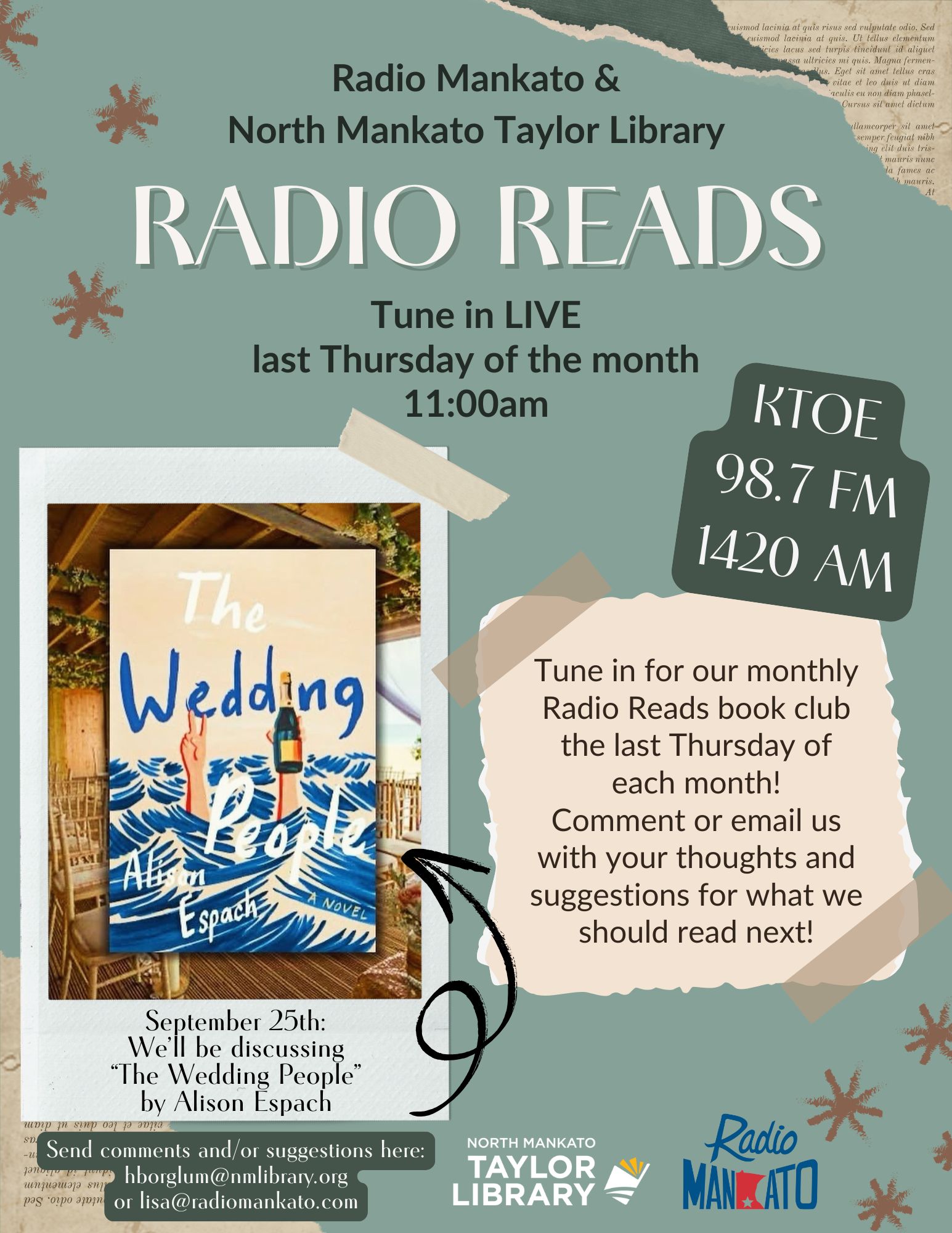 9.25.25-Radio Reads-Hallie, North Mankato Taylor Library-The wedding People by Alison Espach