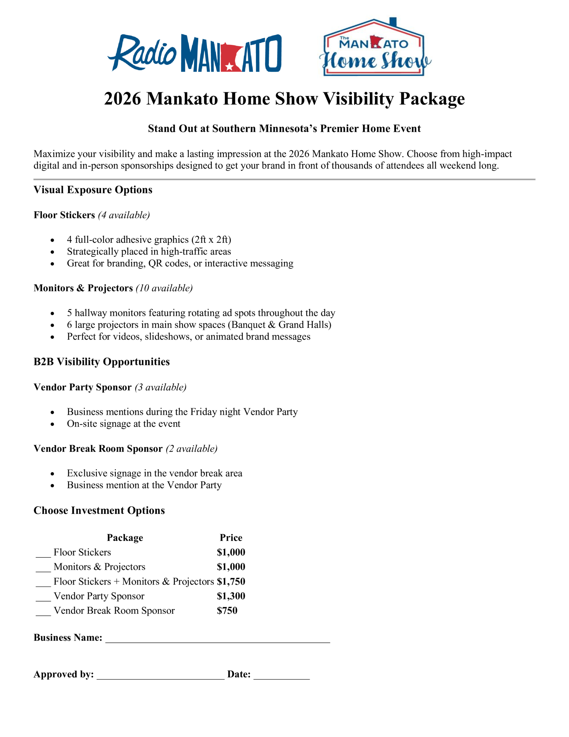 Interested in participating in the show? Below you will find everything to get your business registered for the 2026 Mankato Home Show. If you have questions about registering, please call your Radio Mankato Account Executive.