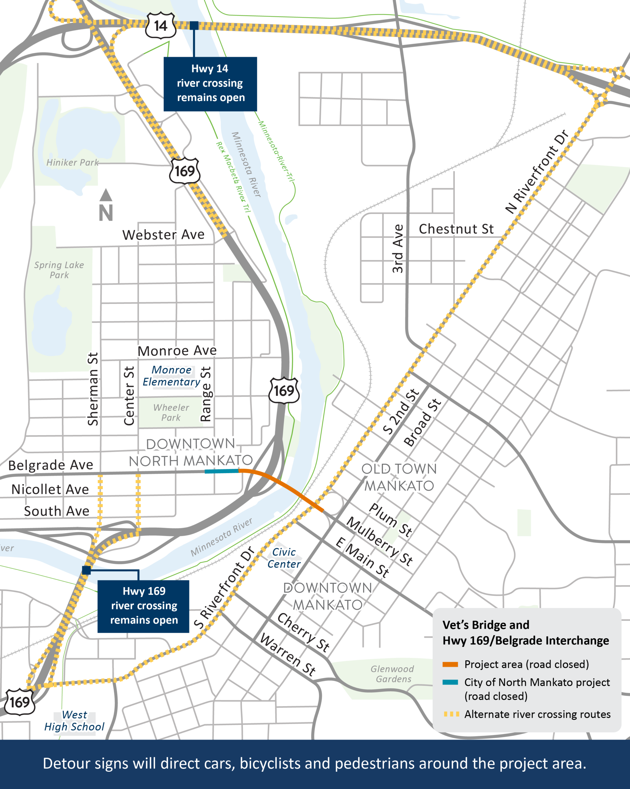 The detour for the Veteran’s Memorial Bridge and Highway 169/Belgrade Interchange project in Mankato/North Mankato is expected to begin on Tuesday, Feb. 3, according to the Minnesota Department of Transportation.